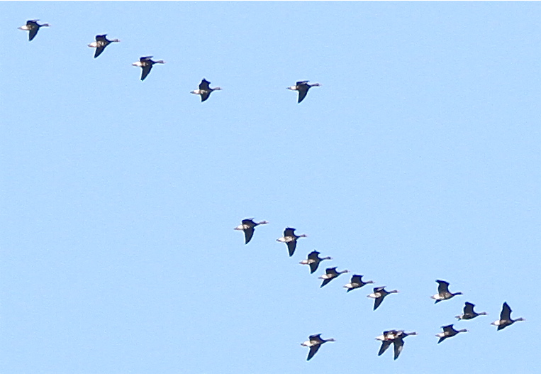 Teil aus einem Trupp mit 27 Ind., ziehend etwa östlich. Bei mehreren Ind. oranger Schnabel erahnbar.