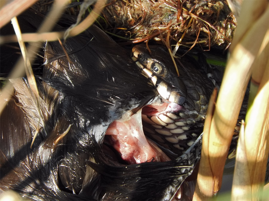 Ringelnatter (ssp. persa) versucht sich an Teichhuhn-Kadaver