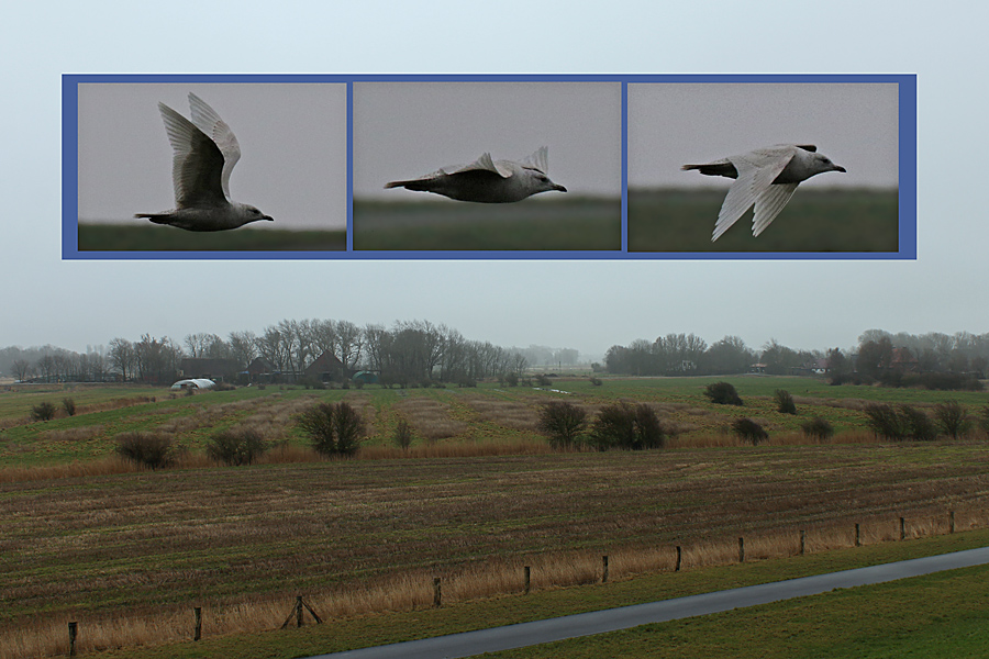 Möwe oft mi Stummöwen vergesellschaftet auf Grünland, aber auch im Außenfeichsland auf Steinmole rastend.