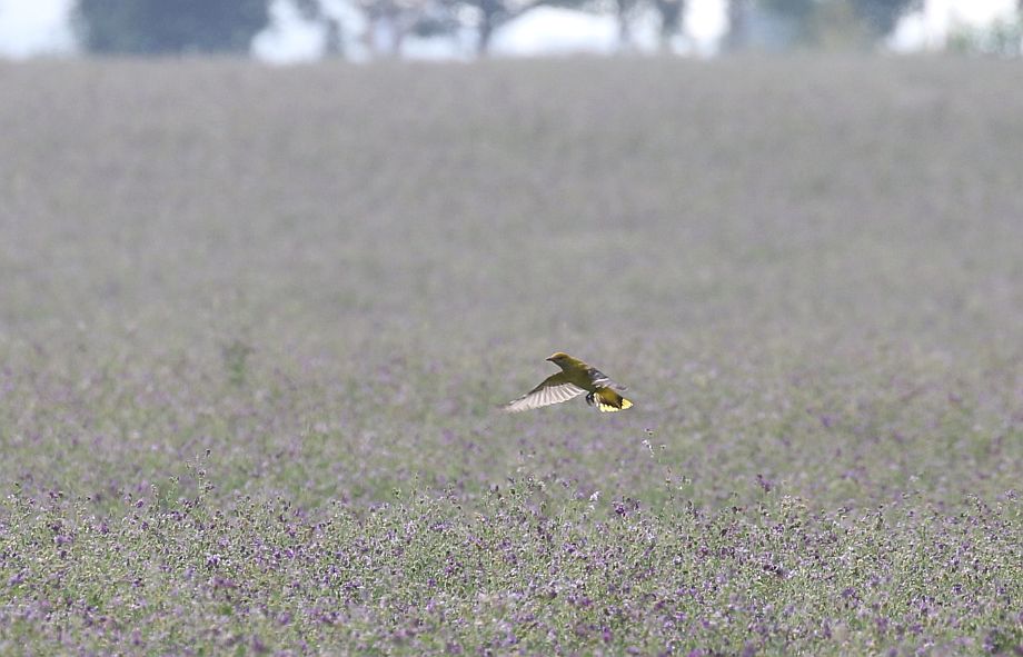 Pirol mit Bienenfressern im Flatterflug jagend über Luzerne
