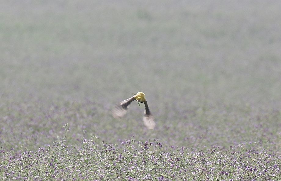 Pirol mit Bienenfressern im Flatterflug jagend über Luzerne