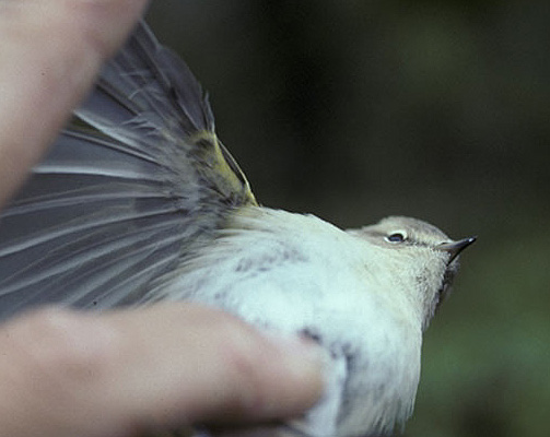 The upperparts were quite uniformly brownish-grey from forehead to upper tail coverts, although rump seems a bit lighter in some photos and there is white on the forehead where the supercilia meet, just above the nostrils, no yellow at all in supercilium or in the broken eyering, the light tips of the greater coverts formed a faint wingbar. The original photos were filmed on Kodachrome 64 and scanned with high resolution. One must also take into consideration the fact that the colour settings of the monitor affect greatly the colours of an image on the screen, especially when poorly set. This particular individual called in the hand a few times ("iip"-call). The call was reminscent of the alarm call of Thrush Nightingale Luscinia luscinia in tone, but much fainter, of course. This observation was accepted by the Finnish Rarities Committee on the basis of a set of prints and detailed description."