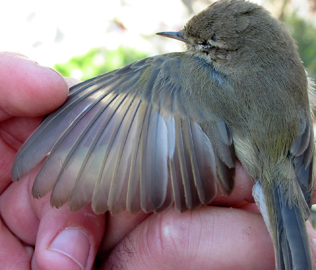 The following measurements were taken: wing length 55mm, tail 54mm, bill tip to skull 11,2 mm, tip to nostril 5 mm, 1p = 7mm, distance 1p til 2p = 22mm, 2p= 8 8/9. The underside was pale white/buff without any trace of yellow. There was no trace of yellow in the eye-brow. The only yellow on the bird was at the wing bend and a little on the underwing, which is acceptable on a tristis. With the bird in the hand, we agreed that crown, nape and back were uniformly brown, with the only green on wings and tail. The call was very similar to the tristis -call on the CD Eastern Vagrants. The pictures were taken with full sunlight on the bird.