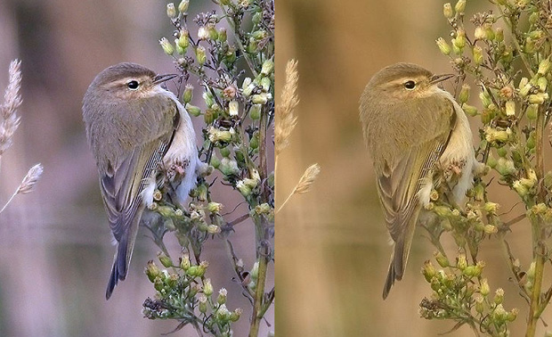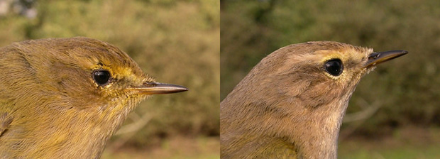 Hence I have made up a composite image which is shown here. On the left is an excellent image of the Warwickshire chiffchaff as it truly appeared in the field. On the right is another photo which, although admirably sharp, completely misrepresents the colours of the bird, making it look much too brown and buff. Note that these two photos are of the SAME bird and taken by the SAME photographer (Steve Seal). Looking at the right hand photo overall, and taking the background into account, it is clear that it is brown-biased and olive/yellow deficient but, if taken at 'face value', it could easily be identified as a pale example of tristis. This effect results no doubt from the ambient light conditions, and is beyond the direct control of the photographer. It is, I suspect, at work in some of the photos circulated for this paper. Overall, this series of photographs confirms my impression that diagnosing chiffchaffs from photographs is fraught with difficulties and likely to be error-prone. I am firmly of the opinion that rather few photographs provide a truly accurate colour representation and, as the balance of hues such as brown, grey, olive, buff and yellow are critical in the diagnosis of subspecies, this is a major short-coming. Thus, only where images are of the highest standard and where the background etc indicate that the 'colour balance' is accurate, do I feel at all confident in assigning birds as tristis."
